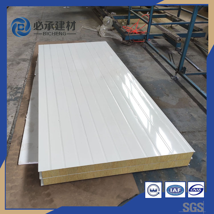 巖棉塊之間和巖棉與上、下層鋼板之間通過高強(qiáng)度發(fā)泡劑粘接而形成整體,精良的生產(chǎn)工藝保證了高密度的巖棉隔熱體與金屬板內(nèi)壁之間能產(chǎn)生極強(qiáng)的粘著力,從而使巖棉夾芯板具有很好的剛度。